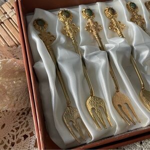 RARE Ornate Gold Hammered Miniature Tea Spoon Fork Utensil Appetizer Set
