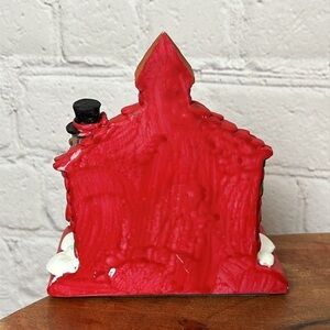This is a pair of vintage Christmas stocking holders made of hand-painted polyresin. The original boxes are NOT included. Both stocking holders feature a church with red roof and bell tower. On one stocking holder a Victorian family holding songbooks is singing Christmas carols in front of the church. On the other Santa Claus with his bag of toys and two reindeer are standing in front of the church. The stocking holders are flat on the back. The stocking holders have a foam rubber lining underneath.