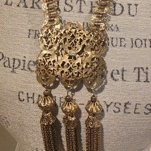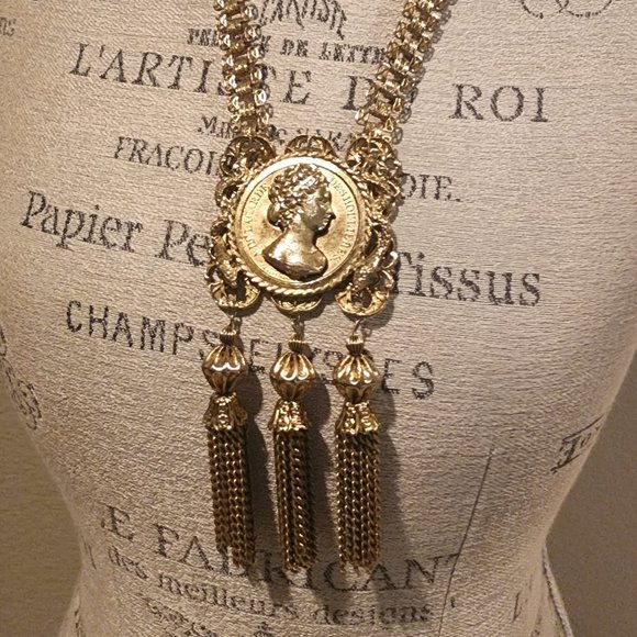 RARE Pauline Rader Coin & Tassels Statement Necklace Vintage Goldtone EUC