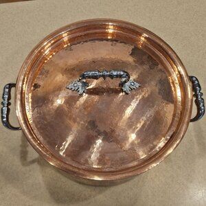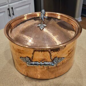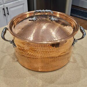 This for an AUTHENTIC Ruffoni Convivium Hammered Copper 10 1/2 Quart Stockpot. This is hammered copper and has a tin lining inside. Made in Italy. This was purchased and stored away. It has never been used. It measures 9 1/8"H (from top to bottom...with the lid on.) It measures 14"W (from end of one handle to end of other handle.) It measures 10 3/4"W (at base, from left to right.) It measures 6 1/4"H (on the interior of the pot from top to bottom... without the lid.) Bottom is marked, "Ruffoni Made in Italy." This does have wear, tarnished, spots, scratches, and stains from storage. Comes from a non-smoking home. Pictures of actual item.