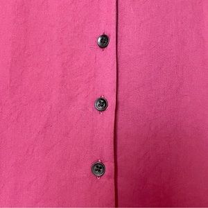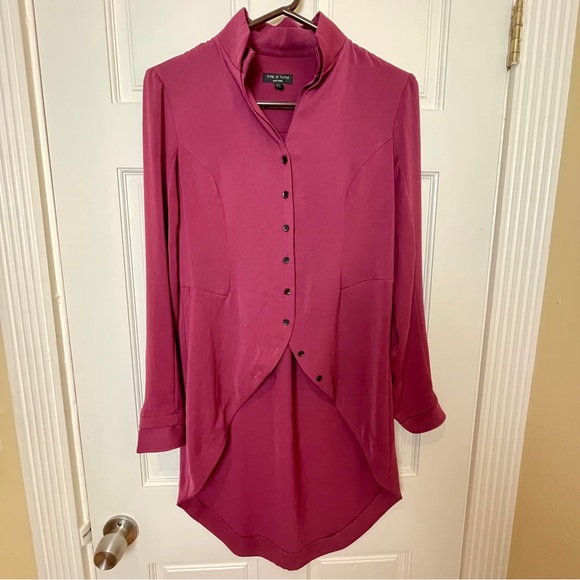 Features a tuxedo style shirt. Somewhere between a blazer & a button up. Double collar, doubling details on the sleeve. Great tailoring. Hi-Low cut. Can be worn as a shirt buttoned or open over a cami.