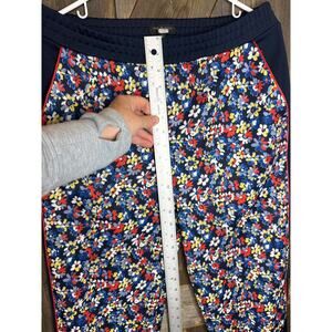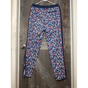 These Rag & Bone women's pants in size medium feature a vibrant floral print complemented by dark blue solid stripes down each side. The side zips on the cuffs add a unique touch, allowing for adjustable styling.