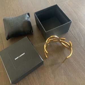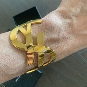 Adjustable YSL Logo bracelet IN BOX—vintage, great conversion piece. You can adjust/bend larger/smaller to fit your wrist if needed. See pics for detail.