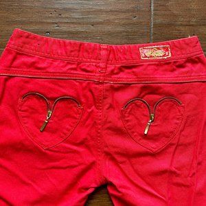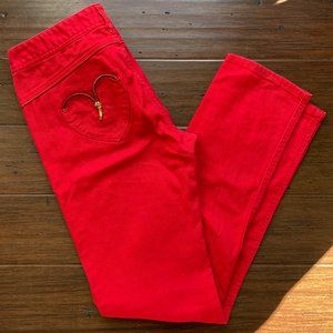 Details: Stunning red denim skinny / slim leg jeans with heart pocket detail. Heart pocket is constructed using a zipper. All hardware and embroidery is gold; small trim details are a matching red leatherette. Made with 4% Spandex, so has a decent amount of stretch. Mid-to-low rise.
