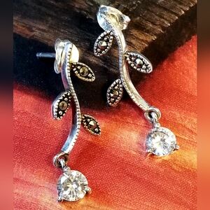 P0973 Sterling Silver and Marcasite Flower Earrings with Cubic Zirconia drops on posts. See pics for measurements.
