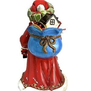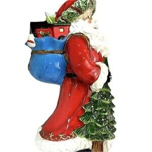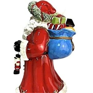 Celebrate the season with elegance and old-world charm with this RARE 17-inch Sorelle Santa Claus figurine, masterfully crafted from fine porcelain and richly hand-painted. This collectible Santa features exquisite gold accents, a vibrant red coat, and intricate details from head to toe—including a festive Christmas tree and a tiny toy Santa dangling from his mittened hand.