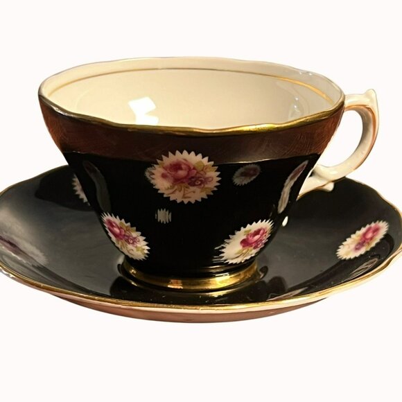 This exquisite Spencer Stevenson Co. LTD bone china cup and saucer set features a delicate hand-painted design with rose medallions. Accented with 22Kt gold trim, this set embodies elegance and craftsmanship, making it a perfect addition to any tea collection.