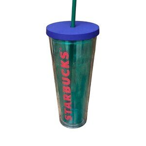RARE Starbucks Coffee Tumbler Clear Teal w/ Clear Teal Straw Navy Lid 2014