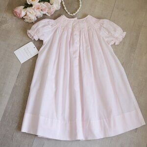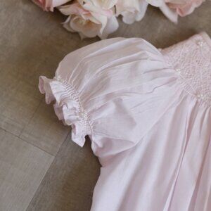 This Strasburg classic pale pink bishop dress is beautifully detailed with hand embroidery in white with added seed pearl accents for a touch of elegance. This design has not been produced in over a decade, making it a SPECIAL FIND! Made of 100% cotton lawn. Hand-smocked at the neckline and sleeves. Sleeves have seed pearl accents as well. Pearl details are gorgeous!!!!! Size 12 Months but will accommodate 18 months depending on desired length (Length is 20 inches from top of shoulder to bottom of hem). Perfect for Spring or Summer vacations, church, portraits or any special occasion. New with tags. Perfect Condition!!!
