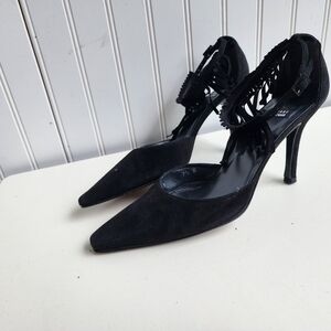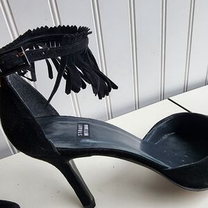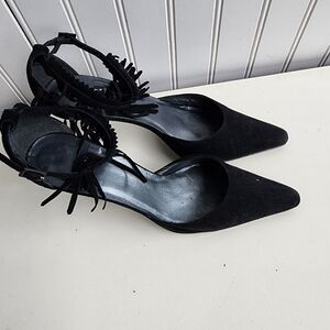 RARE Stuart Weitzman Fringelica Suede Point Toe Pump Black Ankle Strap Heel 7.5