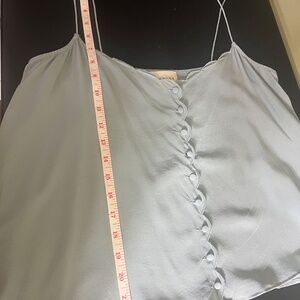 The prettiest baby blue color, this ultra feminine button up camisole features a scallop neckline and covered buttons. Spaghetti straps. Fits sizes 6-10 medium or large. No flaws. Never worn.