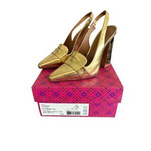 RARE TORY BURCH SADIE GOLD MIRROR SLING BACK HEEL SANDALS SZ. 6.5
