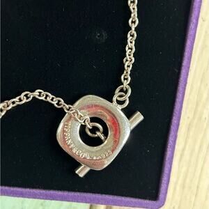 This sterling silver bracelet features square links and a toggle closure stamped with the "925" metalmark and the Tiffany hallmark with Elsa Peretti signature between them . It's ideal for everyday wear. I took photos showing the reflections so you can see the scratches. They don’t look as bad in person while wearing. Just wanted to photograph to show that. I believe Tiffany will polish it for you.
