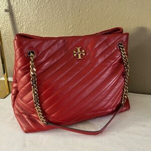 RARE Tory Burch Kira Chevron Tote Red Quilted Lambskin Gold Chain Straps