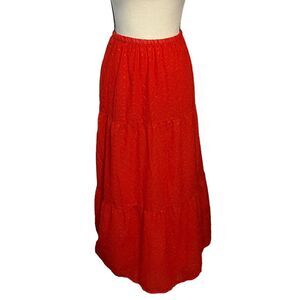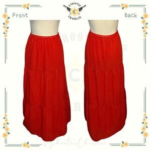 Elevate your wardrobe with this RARE True Beauty By Emme Women's Long Tiered Skirt. Adorned with beautiful red eyelet lace, this skirt is a unique find. The tiered design adds a touch of elegance, making it perfect for special occasions or adding flair to your everyday style.