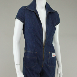 One of a kind rare find, l960s Levi romper made of the classic dark denim/orange stitching; closing with a full length "Scovill" zip. Fabulous piece of history in excellent condition! There are two tiny threaded spots on the bodice where the Levi retail tag was normally placed. Tag obviously removed by its owner leaving the thread behind. To not compromise the integrity of the piece I leave the simple snip to the buyer.