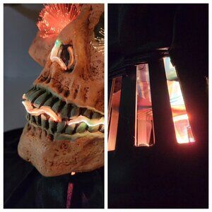 Used in box. It lights up however the motor that spins the colored disk to change the fiberoptic colors on the skull doesn't spin all the way. It just ticks back and forth also making a light ticking noise. See the video for best description.