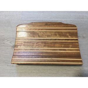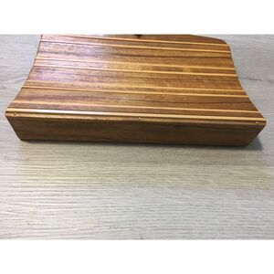 This vintage Mid-Century Modern hand-crafted Earl Gresh wooden clutch purse is a unique and stylish accessory that adds a touch of old-world charm to any outfit. this purse features a beautifully crafted wooden exterior with intricate detailing, making it a standout MCM piece. The compact design is perfect for evening events or special occasions, and it’s marked with "St. Pete, Florida," adding a local touch to its vintage ~1950s appeal. The inside is crafted from a light tan woven cotton material and has various pockets, as well as a stand-alone detached card holder.