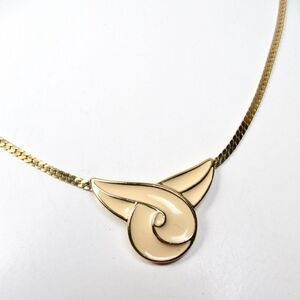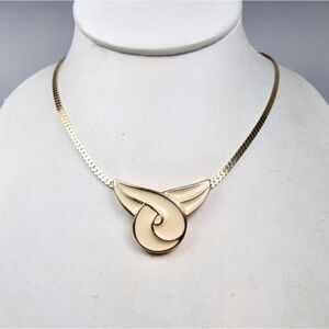 This vintage necklace is a rare and stunning signed Trifari piece, showcasing the hallmark elegance of mid-century jewelry design. The necklace features a 16-inch gold-tone chain with a flat, sleek pattern, perfectly accentuating its luxurious feel. The central pendant is exquisitely crafted in a striking swirl design, detailed with smooth, creamy white enamel that contrasts beautifully with the golden outlines.