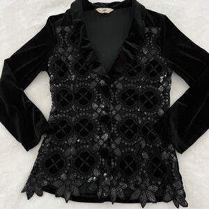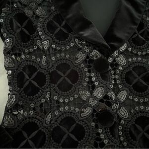 -black velvet blazer with vintage crochet lace front and sequin detail