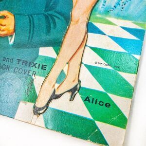 The front dolls are trying to come free, but secure so far; Alice has a small crease at her knee. The back side shows some sun fade (see pic). Outfit pages show toning due to age, but no cuts, tears, or blemishes.