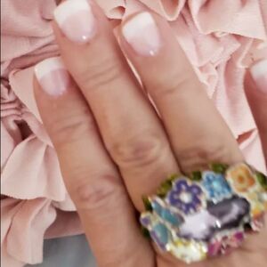 Like new! Wear on two fingers, size 7/8! Faux amethyst! Gorgeous enamel floral design!
