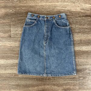 Authentic vintage high-waisted denim skirt. Made in the USA. Flattering A-line silhouette with a classic 5-pocket design. Metal Scovill zipper, and snap button fly. Made from 100% cotton indigo denim with beautiful vintage fading