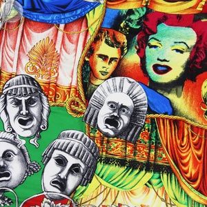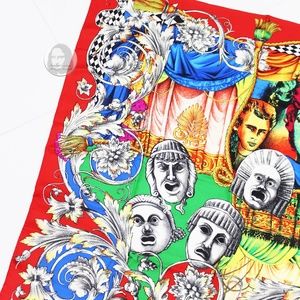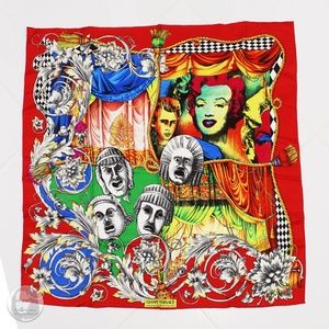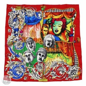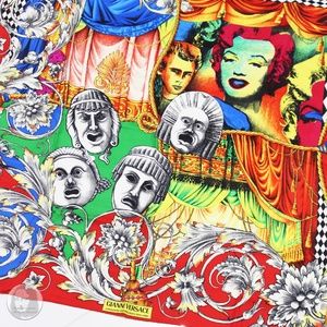 Authentic and highly collectible vintage Versace silk twill scarf from 1998, created in collaboration with Fondazione Antonio Ratti. This stunning piece features iconic portraits of Marilyn Monroe and James Dean, set against a vibrant red backdrop with bold Roman motifs and theatrical elements—a true representation of Versace’s dramatic and artistic vision.
