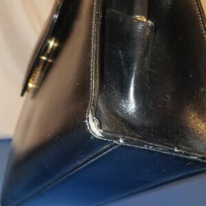 There are a few worn spots on the edges (see photos). One of the handles in the back is worn (see last photo). Use care when handling. It has been stored in a dust cover to protect the leather and really is a stunning handbag.