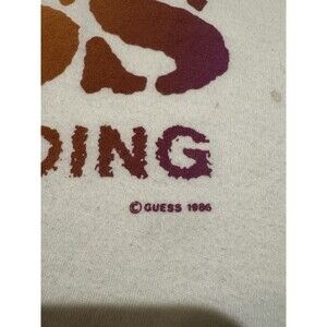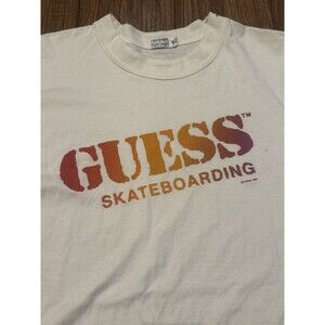 The product is a rare vintage 80s Guess skateboarding USA t-shirt in size M. This classic white t-shirt features a solid pattern, short sleeves, crew neck, and is made of cotton. Manufactured in the United States during the 90s, this piece of streetwear is perfect for those who love 90s themes and appreciate vintage style. The Guess brand adds a touch of nostalgia to this iconic men's t-shirt.