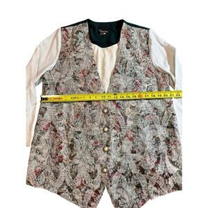 This rare vintage 90’s Nu Venture floral vest and detachable white blouse set is a stunning example of retro fashion, offering a unique blend of floral and classic styles. Featuring delicate pearl button accents and a tie-back design, this set is perfect for adding a touch of vintage charm to any wardrobe. The vest and blouse are versatile, and though marked as a size S, they measure closer to a medium or large. Please refer to the measurements in the photos for accurate sizing.