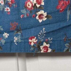 Style: lightweight cotton blend mini skirt with front button fly, front and back pockets, “Ralph” embroidered on back pocket; dark blue with red and white flowers