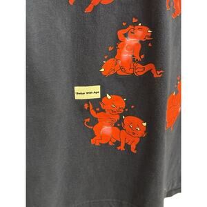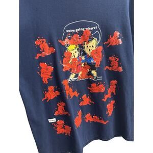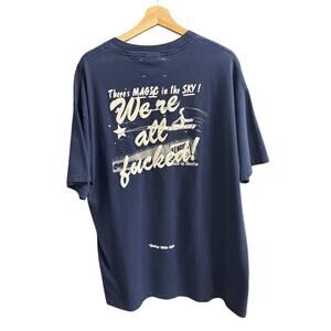 The product is a rare vintage Better With Age 'We're Going Where' T-shirt in size XL. This white t-shirt is made of cotton and features a regular fit with a round neckline and short sleeves. Perfect for men looking to add a unique and nostalgic piece to their wardrobe, this shirt is a statement piece that embodies the vintage aesthetic.