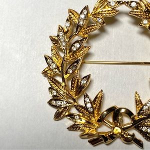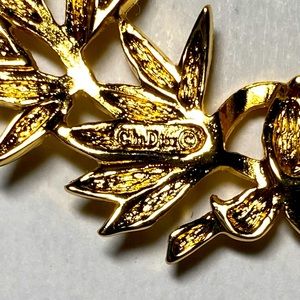 RARE vintage CHRISTIAN DIOR gold plated wreath embellished with crystal rhinestone flower leaf brooch pin. 1980’s collection in Art Deco style. Marked “Chr.Dior@“ on back side. Straight pin with secure rollover clasp. Width 2.21” x Length 2.21”. Pre-owned, but never worn. Excellent condition. My elderly mother worked at the Dior factory for 15 years setting crystal rhinestones and is now selling her beautiful collection.