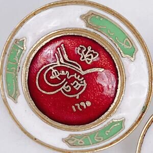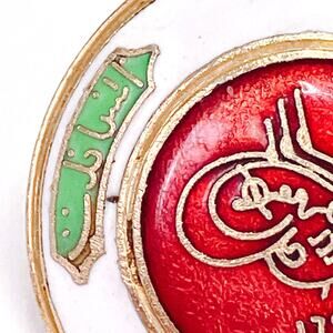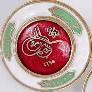 These unusual Coro screw-back earrings, in a cloisonné style, are an uncommon departure from the company’s familiar florals and rhinestone pieces. Red, white, and green enamel frames an Ottoman-inspired tughra motif with dated script, a subject rarely attempted in American costume jewelry. The design links Coro to mid-century novelty lines that borrowed from international and medallic imagery. Collectors will recognize them as a scarce example of Coro’s more experimental Heraldic Line, modeled after the Ottoman Şefkat Nişanı (Order of Charity) design—produced in the late 1940s to early 1950s.