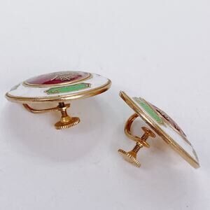 Features: Screw-back earrings; Ottoman-inspired tughra motif; red, white, and green enamel; signed Coro on screw backs; cloisonné style