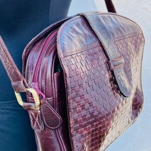 This beautiful find from the 60's is rare! Condition is fine. Intrecciato leather is supple and is actually Oxblood color in some light. Bag was photographed outdoors so you can see it in natural sunlight. Medium size bag has 3 sections: Central section is closed with a zipper; the 1st and 3rd close with snaps. Inside there is a zipped pocket with the Fendi logo and the words Roma, Italy.