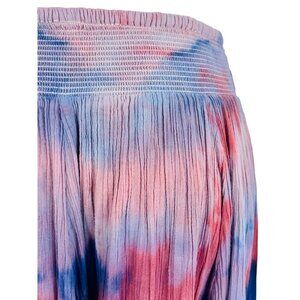 This exquisite Free People skirt exudes an essence of timeless beauty with its custom tie-dye artistry, reminiscent of vintage 60s boho fashion. Its flowy silhouette & gauzy texture offer a sense of nostalgia, while the ruffle hem adds an elegant touch.