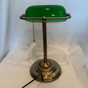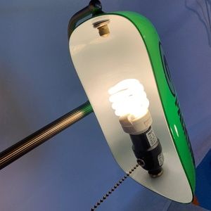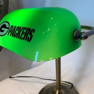 The lamp features the iconic Packers 'G' logo and is meticulously designed to resemble a traditional banker's desk lamp. It exudes vintage charm and serves as a unique collectible item for fans of all ages. It is in good condition, showing some light wear from age, such as a small mark on the logo, as well as two small chips on the corner of the lamp. It is fully functional and has been tested.