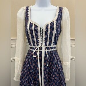 RARE Vintage Gunne Sax Prairie Dress Blue Floral Lace Peasant Cottagecore