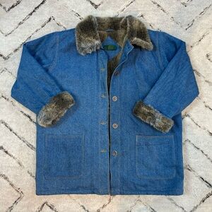 RARE Vintage Hunters Run 90s Denim Chore Coat Jacket Faux Fur
