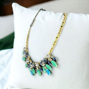RARE Vintage J. CREW Necklace Brulee Blue Green Crystal Rhinestones Gold Tone