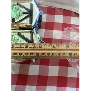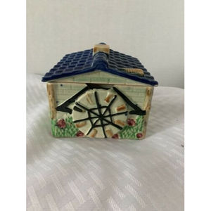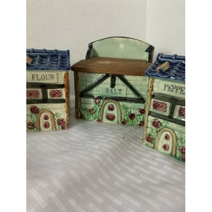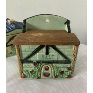 RARE ~ Vintage Japanese ~ Green Majolica ~ Salt Box Salt And Pepper. Pieces are in vintage condition. Salt box is in pretty good condition, chipping as shown of the flour and pepper on the sides of the roof. the little house with the water wheel, It has a large crack. I wouldnt even have included this with the listing but it does match. I cant guarantee that it will survive shipping. All pieces will be packaged well and there should be no problems shipping. Just due to the large crack I cannot guarantee this will make the trip. Please see all pictures and I will send more upon request. I will wrap and pack carefully. Please ask any questions you may have.