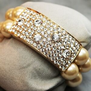Blinding, crystal encrusted, double strand simulated pearl bracelet by Kenneth Jay Lane is perfect for larger wrists. It is designed with simulated pearls (14 mm) on stretch elastic fixed to a gold plated, Austrian crystal encrusted pendant. This piece would make a stunning addition to your collection or a lavish gift for your favorite Kenneth Jay Lane lover! This piece is singed KJL on an oval cartouche on the reverse. Purchase includes red gift box. More photos available upon request.