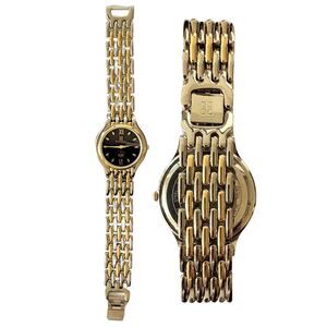 This early 1990s Givenchy wristwatch is a rare, limited-edition piece that blends classic dress-watch elegance with a subtle designer edge. Its round black dial offers a striking contrast to the warm gold tones of the case and two-tone bracelet, creating a look that is both timeless and distinctly fashion-forward. The watch design makes it ideal for both men and women.
