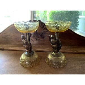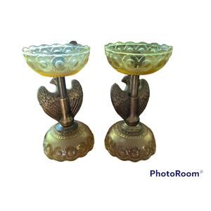 RARE Vintage Mid Century EAGLE Depression Glass & BRASS Candlesticks AMERICANA