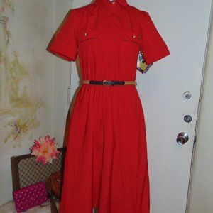 RARE Vintage NOS Sasson Hong Kong Red Cotton Poly Blend A-Line Belted Short Sleeved Dress