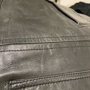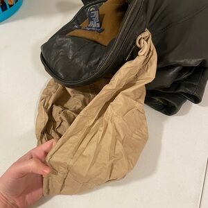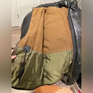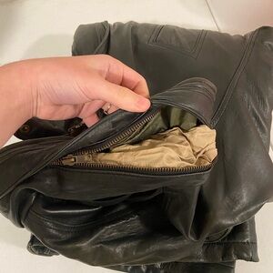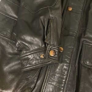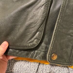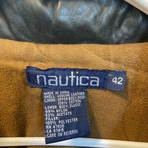 Rare vintage men’s Nautica genuine leather jacket. Jacket is black with green & brown lining inside. Jacket is very heavy duty. Has visible slight wear, mainly on front pockets (shown in images). Has hidden hood in collar & folds very easily to zip back up inside (zipper does not show when wearing—it’s hidden). Jacket zips & buttons shut. Size 42, which is a large/XL. Smoke free home!
