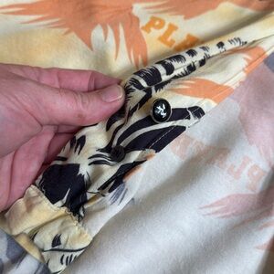 PLAYBOY & Bunny’s are on the body of the shirt along with a Hawaiian beach scene