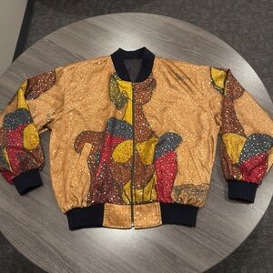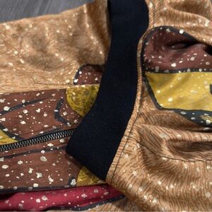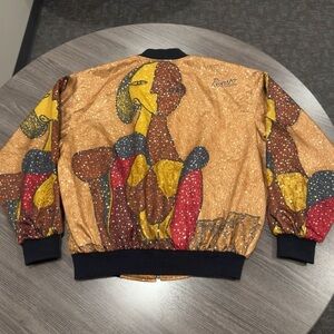 Rare colorway vintage Picasso bomber jacket.Iconic vintage 90s satin 'Picasso' bomber jacket. 100% polyester, much like silk. Jacket features an all- over Cubist art print in red, cooper, black, brown and mustard yellow with metallic silver flecks. Black ribbed knit collar, cuffs and hem. Full front zip, two side slash pockets. Interior is solid black.